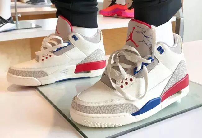 Jordan Brand 为了庆祝 Air Jordan 3 诞生 30 周年不仅复刻经典配色,新品也是频频亮相,即将带来 “International Flight” 系列中就包含了一双美国主题 Air Jordan 3 “USA” ,近日这双鞋的实物首次曝光。鞋款鞋面以荔枝皮打造,白色主调中加入代表美国的红蓝两色,爆裂纹及鞋舌等细节以浅灰色点缀,中底处红蓝两色分割的设计为整体提升辨识度。该配色将于 7 月 7 日在指定 Jordan Brand 店铺正式发售,发售价格为 $190 美元,感兴趣的朋友可以关注我们的后续报道!