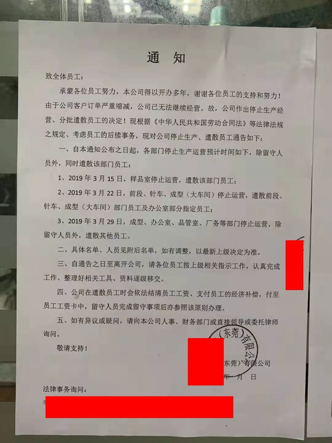 2:2019年3月22日,前段、针车、成型(大车间)停止运营,遣散前段,针车、成型(大车间)的部门员工及办公室部份指定员工。